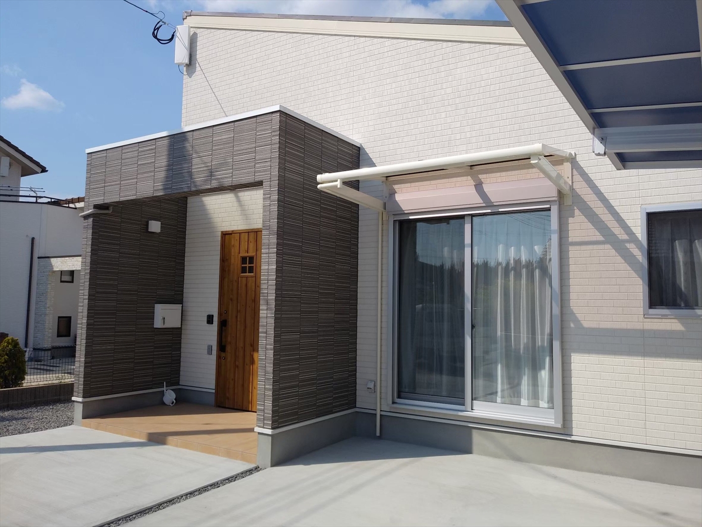 スッキリ片屋根の平屋。ポーチ部分はアクセントとしてデザインの壁と梁を設けました。LDKは16帖もあり各部屋には収納もあります。大収納で片付らくらく♪