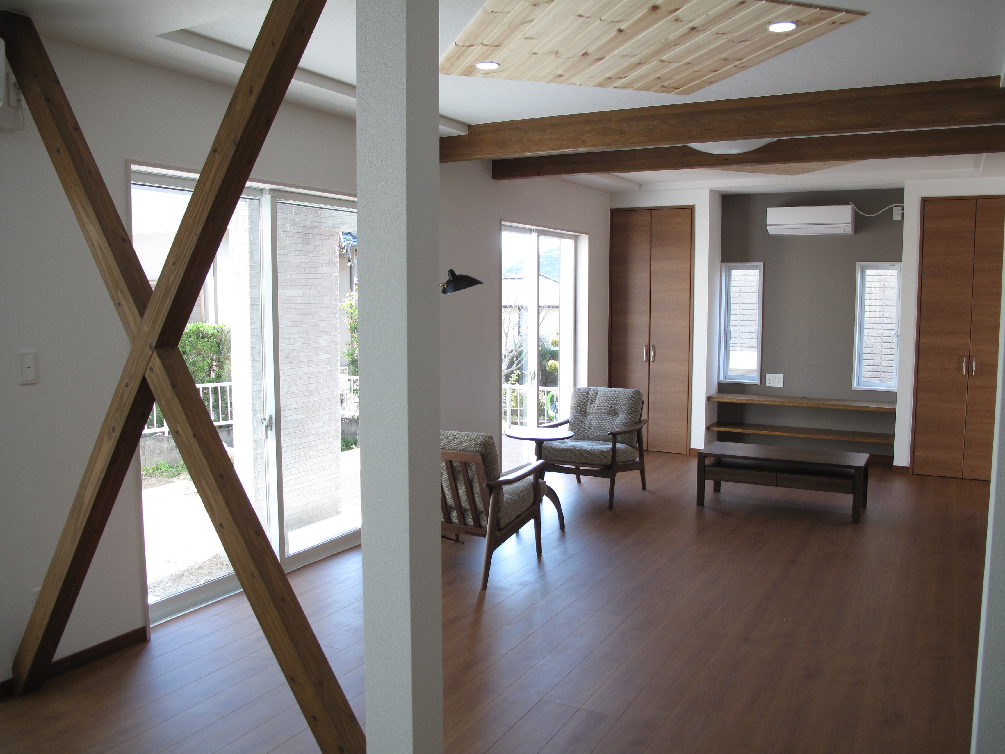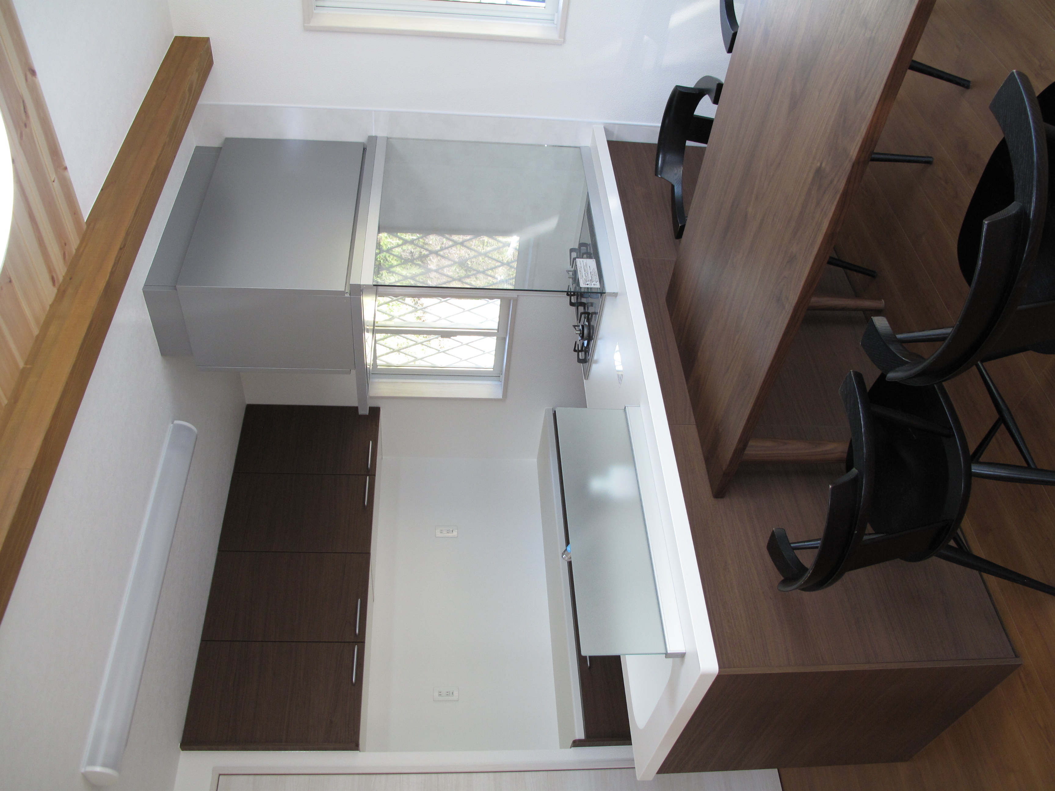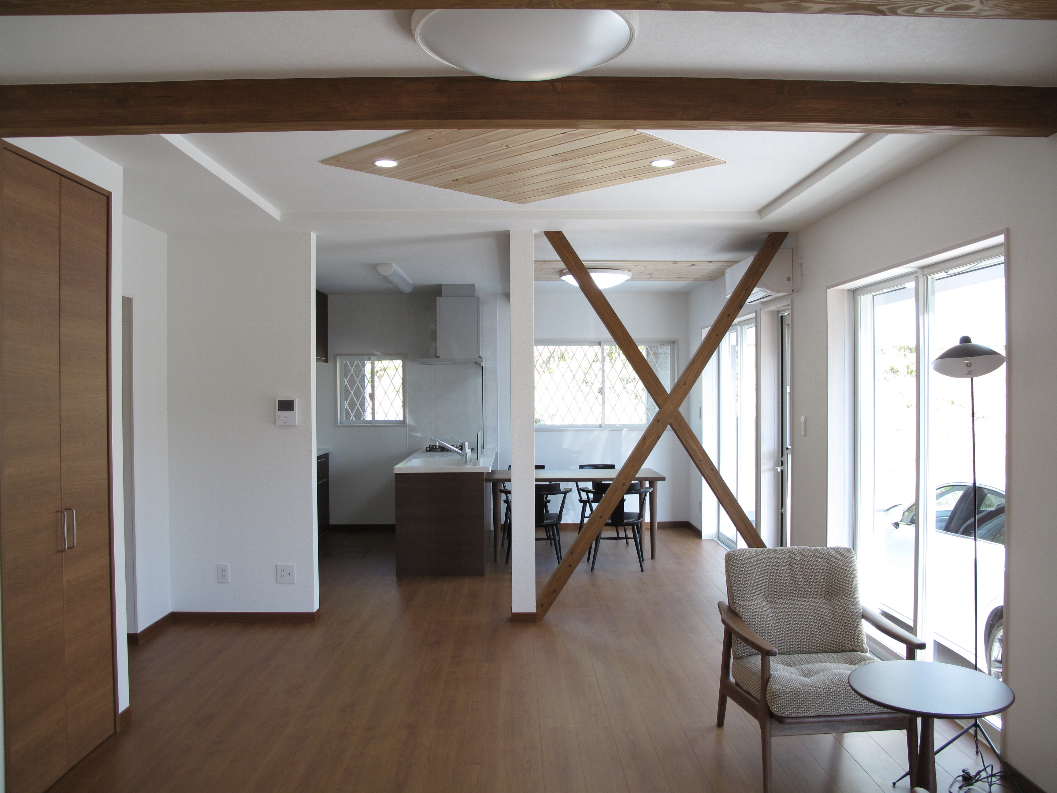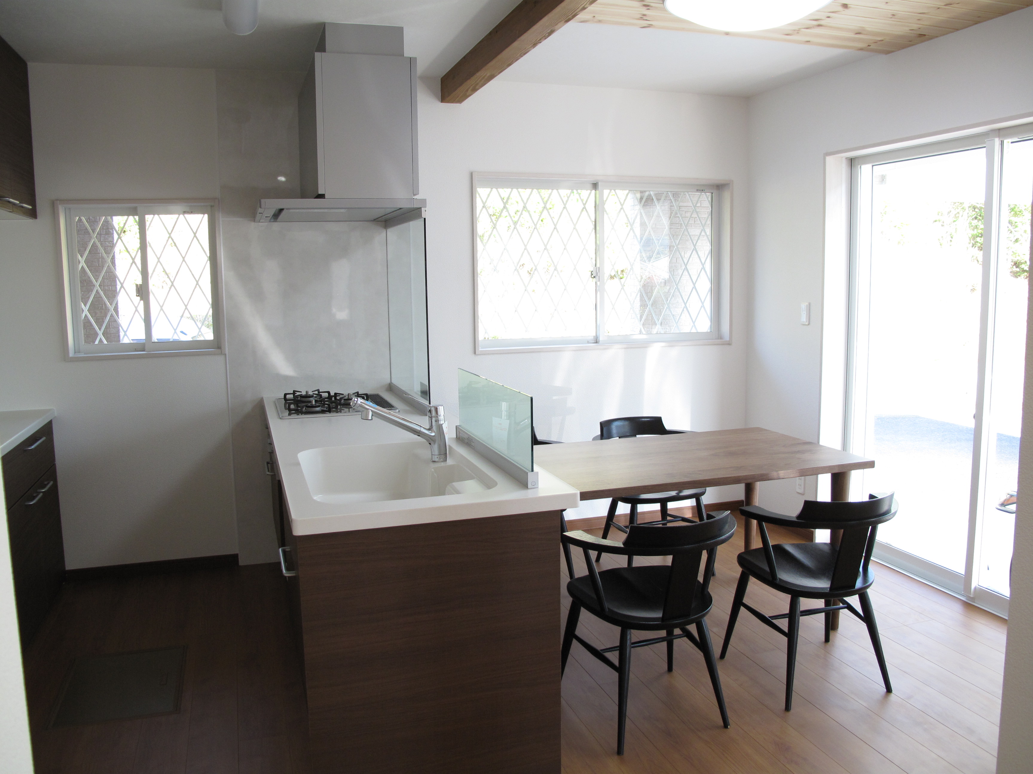 家族が集まる明るいLDKとするために、玄関の位置を変更して、太陽の光を感じることが出来るカフェのような空間となりました。観葉植物が元気に育ちそうです(笑)