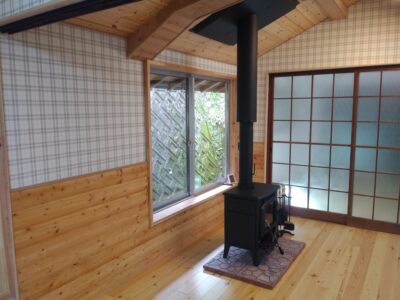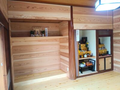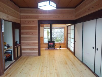 昔ながらの畳みのある和室を一枚板の床材に、壁を羽目板に貼替えました