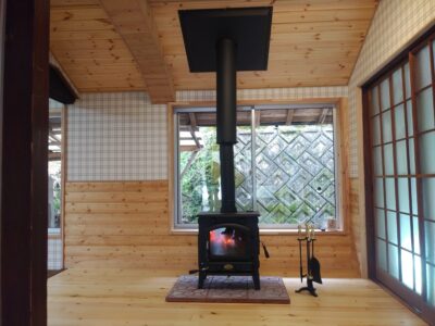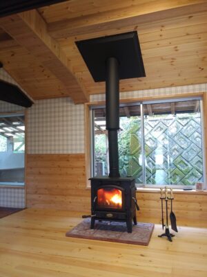 薪入れタイプのストーブを設置し自然と集まりたくなるような温かみのある雰囲気の